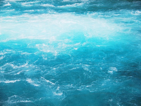 Blue bubbling water of mountain river. Ocean tide of turquoise sea