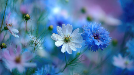 This image showcases a collection of delicate flowers in shades of white and blue, set against a blurred background. The composition employs a shallow depth of field, highlighting the intricate details of the petals. The soft lighting and pastel hues suggest a peaceful ambiance suitable for various design projects.