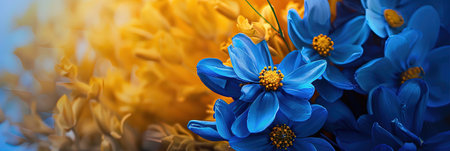 This bright composition of blue flowers against creamy background. Floral banner. Copy space.