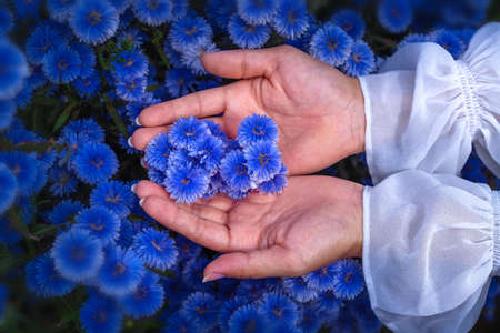 Closeup image of a woman's hand touching on beautiful Margaret flower in the field at Chiangmai, Thailand