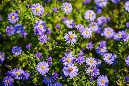 Purple aromatic aster flowers blooming in garden during summer day