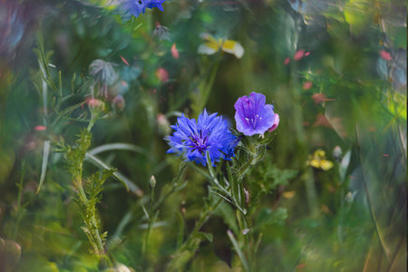 Cornflowers and green grass in sunset light in summer meadow, selective focus. Atmospheric beautiful moment. Wildflowers centaurea close up in warm light, summer in countryside. Environment