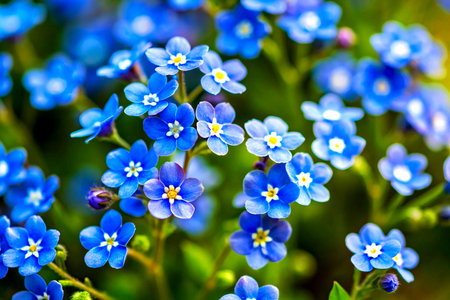 close-up of blue forget-me-not flowers outdoor in sunny backyard shot at shallow depth of field