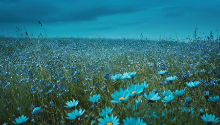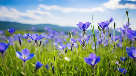 AI Generated. A field full of blue flowers basking in the sunshine
