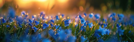 A field of bluebell flowers blooms in the golden light of sunset. The flowers are covered in tiny dewdrops, and the soft background creates a dreamy atmosphere.