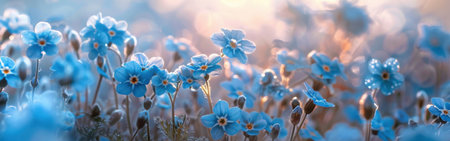 A field of vibrant blue forget-me-not flowers bloom in a sun-drenched meadow, bathed in the warm glow of the setting sun. The flowers stand tall and proud, their delicate petals catching the light, creating a beautiful and enchanting scene.