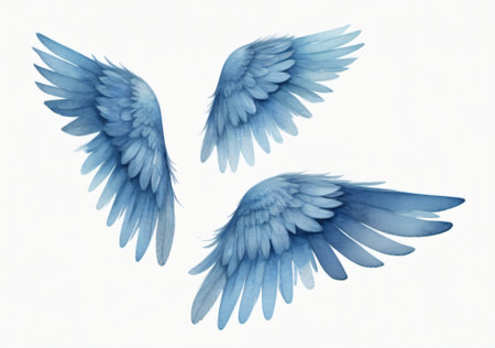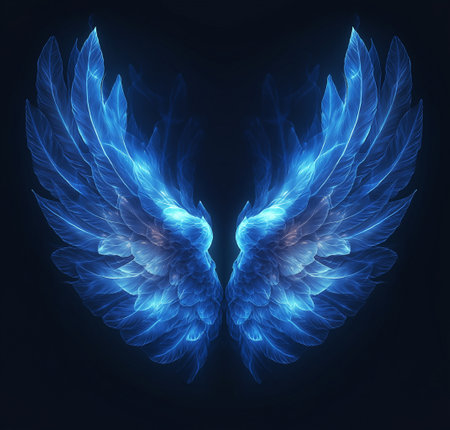 blue wings, ethereal, glowing, abstract art, light effects, mystical background, fantasy, beautiful, luminous, feather texture, dynamic, dreamy feel, sparkles
