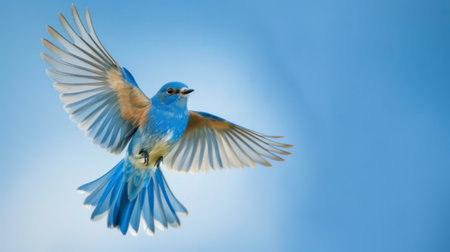 Bird with blue feathers and orange wings is flying in the sky. Generative AI.