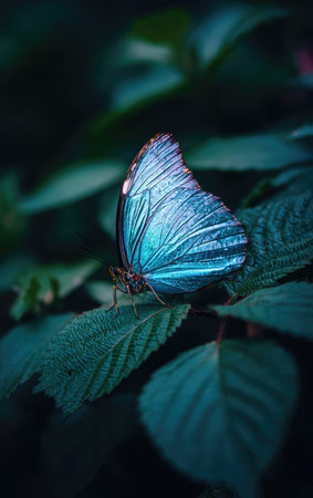 AI-generated A stunning blue morpho butterfly hovers amidst lush green foliage, its iridescent wings shimmering.