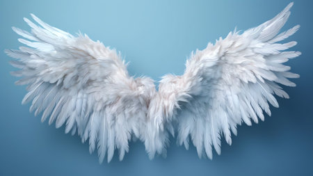 A pair of white wings spread out, creating a symmetrical composition against a dark blue background. The front view showcases a three-dimensional effect, with delicate feathers and intricate light and shadow effects, evoking an angelic theme. This high-definition photograph displays superb detail and realism. --ar 3:2 --v 6.1 Job ID: 0eb105e9-7d4c-4e64-9d9e-c6fc62338281
