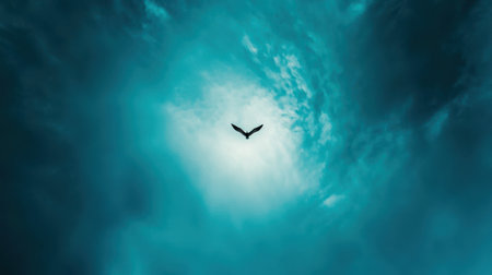 A top-down drone shot looking directly up at an endless empty sky with only a single, distant bird in flight.