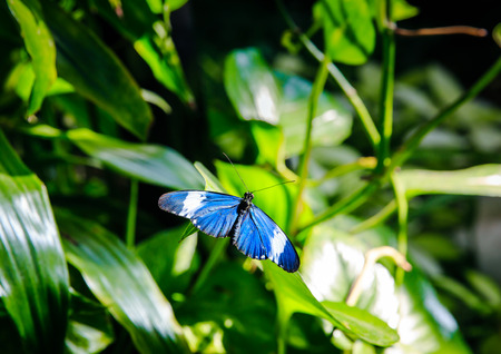Blue butterfly on green leaf in the garden. Beautiful butterfly in nature.