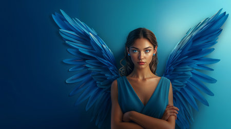 Beautiful girl with blue wings on a blue background. Beauty, fashion.