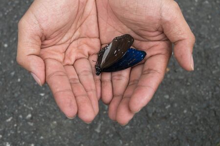 Butterfly in hand on a dark background. Beautiful butterfly.