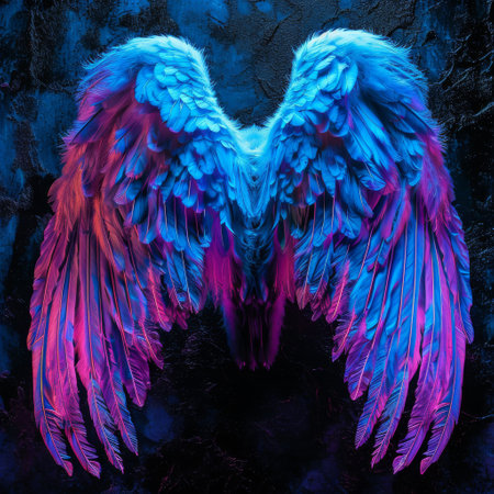 Neon wings attached to a dark wall glowing vividly with purple and blue tones