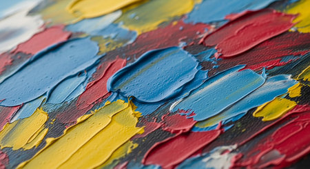 Bold swathes of oil paint in red, blue, yellow, and orange create a captivating visual on canvas, reflecting an artist's dynamic style and creative expression.