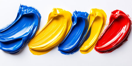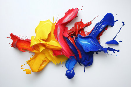 Vibrant splash of red, yellow, and blue paint creates a dynamic abstract composition on a clean white background