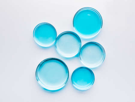 female hand in a blue disposable medical glove holds a container with medication for inhalation in the palm, blue background copy space, treatment of asthma and bronchospasm, pulmonoligia concept