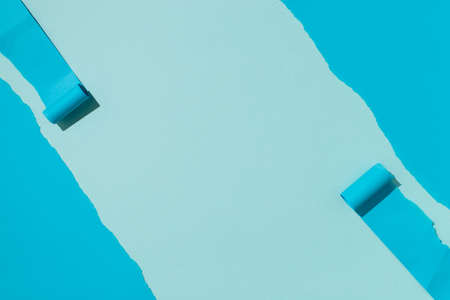 Photo of paper backdrop in pastel and bright blue colors with torn corner isolated with copyspace