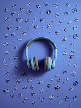 Bright blue headphones on a two-tone background. Mobile audio playback equipment.