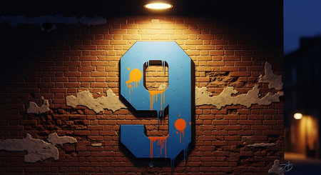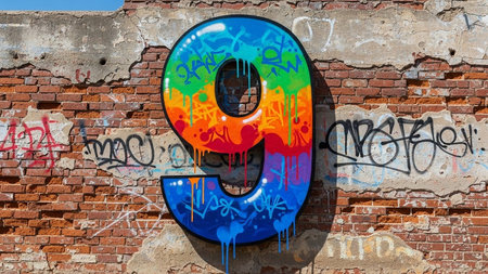 Vibrant graffiti number nine on a worn brick wall with other tags