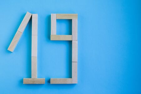 Typical white 3-ply surgical mask with rubber earhooks to cover mouth and nose with English block letters Covid-19 on a blue background. Dangerous virus and quarantine concept