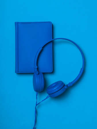 Blue headphones with a blue leather notebook on a blue background. Monochrome image of office accessories.