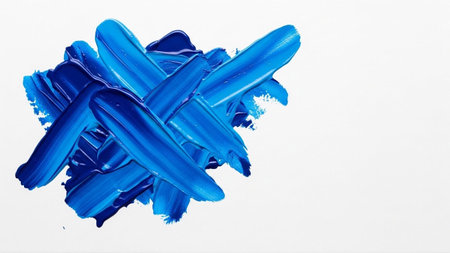 a dynamic cluster of thick, bold brushstrokes in various shades of blue. The paint is applied with a sense of energy and movement, creating a textured, abstract composition against a stark white background. The contrast between the deep blues and the clean white space highlights the artistic expression and the tactile of the paint. The strokes overlap and intersect, suggesting a spontaneous and vibrant creation.
