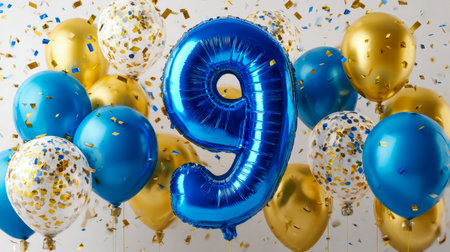 A joyful party scene featuring a prominent blue number nine balloon, artistically encircled by shimmering gold, blue, and confetti-filled clear balloons, radiating celebration and