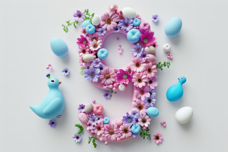 Colorful Easter-themed 3D illustration of the letter with flowers and eggs.