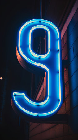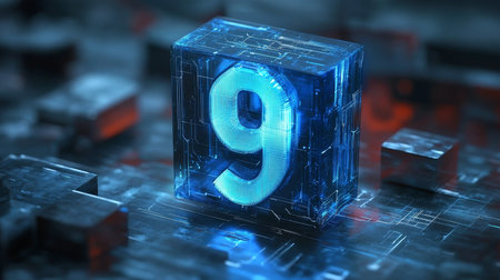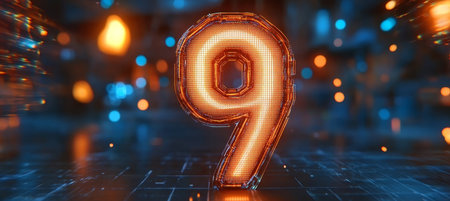 Glowing Digital 3D Number 9 in Futuristic Style, an Abstract Technology Background with Neon Lights.
