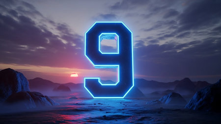 A neon blue number nine glows in a desert landscape at sunset with mountains in the background