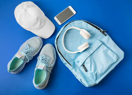 Sport shoes, backpack, cap, mobile phone and headphones on color background
