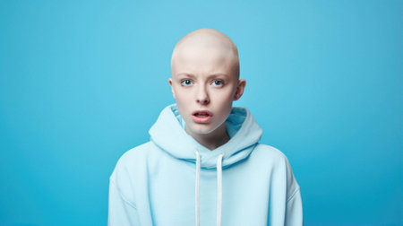 teenage girl in soft sweatshirt thinking and looking away isolated on blue