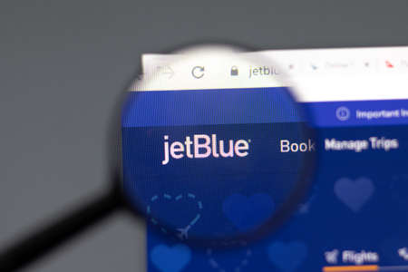 New York, USA - 15 February 2021: jetBlue website in browser with company , Illustrative Editorial