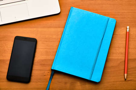 Closed notepad, pencil and smartphone, coral and ntoebook keayboard
