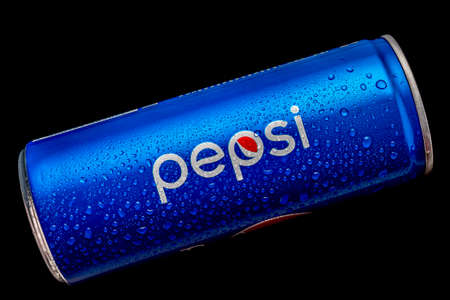 Pepsi 250 ml can with water drops isolated on black background. A popular drink around the world. Russia, Krasnodar, December 15, 2021