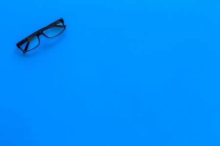 Glasses with transparent optical lenses on blue background top view.