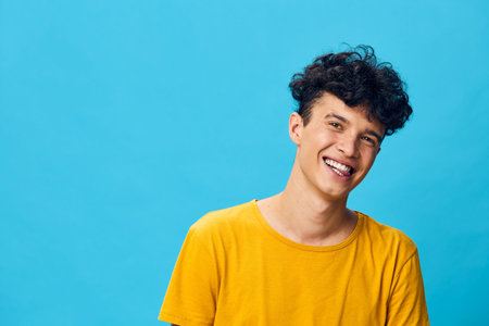 cheerful young man smiling against a bright blue background, wearing a yellow shirt, expressing joy and positivity, ideal for themes of happiness, youth, and friendship