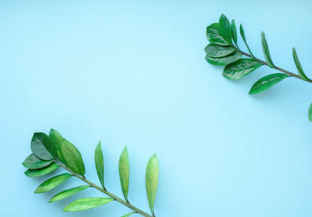 Blue background with branches of green leaves and cotton flowers. A place for text. View from above.Flatly