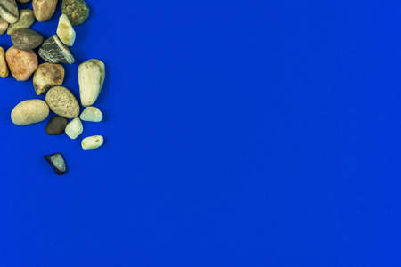 Summer flat lay background with sea pebbles, copy space and top view photo