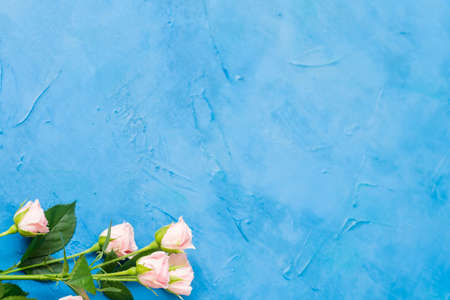 Delicate pink roses. Flower gift concept. Copy space on blue background.