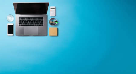 flat lay Office desk table of modern workplace with laptop on blue table, top view laptop background and copy space on blue background, blue desk office with laptop, smartphone and other work supplies