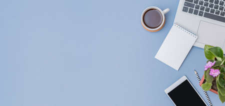 Flat lay home office desktop with laptop, flowers in a pot, office supplies on a blue background