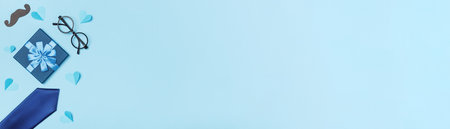 father's day banner. Box with gift glasses mustache men's tie with paper hearts on a blue background.