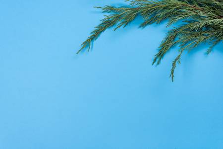 Background of juniper branches. Blue background, copy space, top view