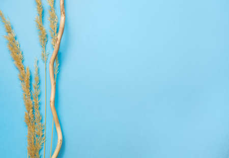 Minimal flat lay concept with blank white card, mockup floral background on a blue paper with dried flower