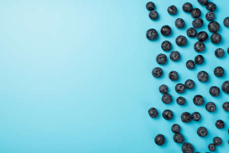 Top view photo of scattered blueberries on the right on isolated pastel blue background on the left