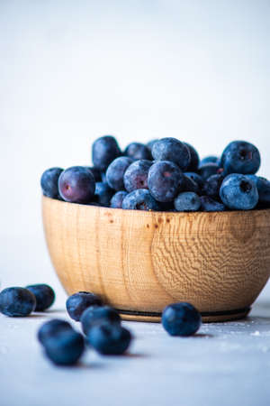 Against the background of a brown wooden wall is a light wooden bowl of fresh blueberries, a housewife from the buyout will make jam