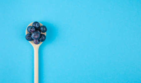 top view of fresh ripe blueberries on wooden spoon on blue background with copy space